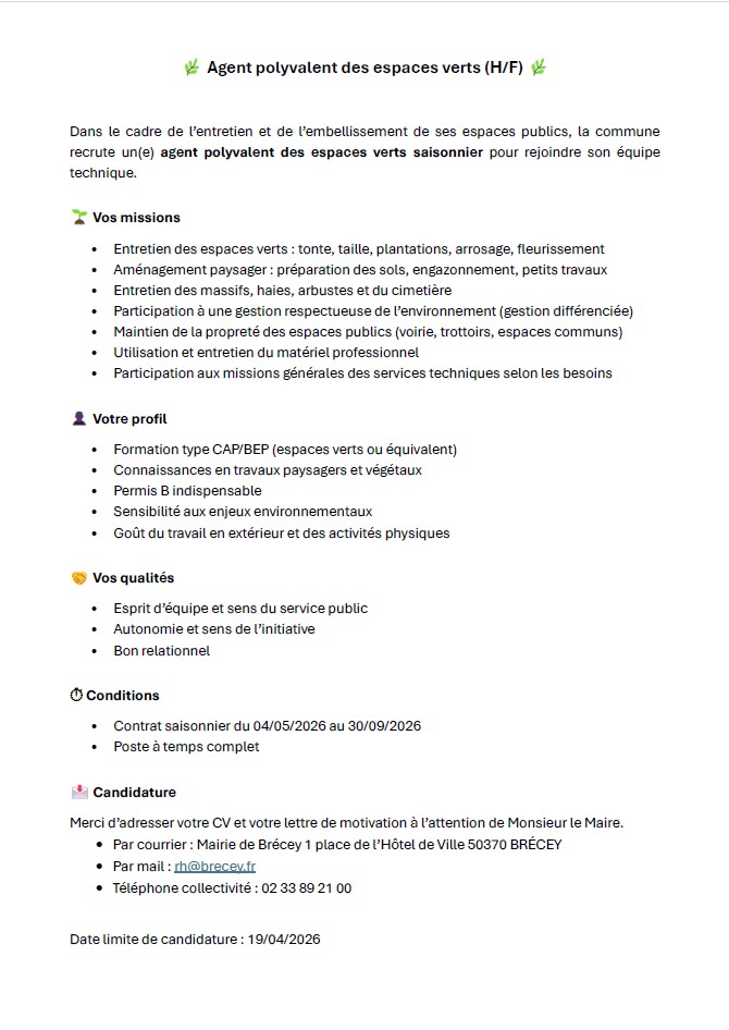 La commune de Brécey recrute un agent polyvalent des espaces verts, merci d’envoyer votre curriculum vitae et votre lettre de motivation avant le 19 avril 2026 .